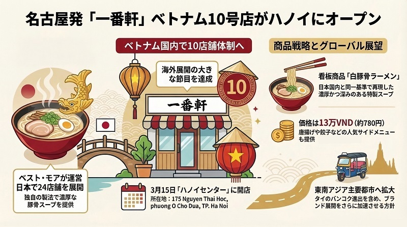 「豚骨麺屋一番軒」や「肉汁餃子のダンダダン」などの飲食店運営・食品販売を手掛ける株式会社ベスト・モア(愛知県名古屋市)は3月15日、ハノイ市の商業施設「ハノイセンター(Hanoi Centre)」に名古屋発祥の本格豚骨ラーメンブランド「一番軒」の新店舗をオープンする。これにより、同ブランドのベトナム国内における店舗数は10店舗体制となる。