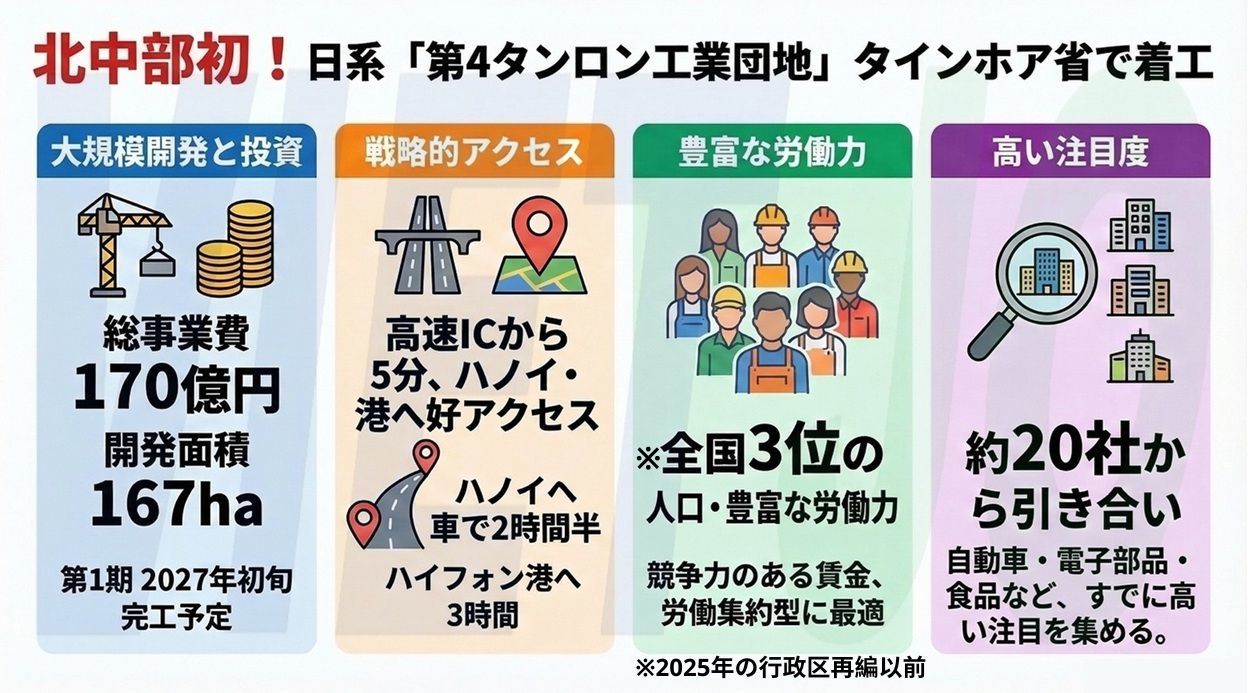 また、タインホア省は、ホーチミン市とハノイ市に次いで全国で3番目(※2025年の行政区再編以前)に人口が多く、賃金水準も比較的安く抑えられていることから、労働集約的な産業の集積が見込まれている。