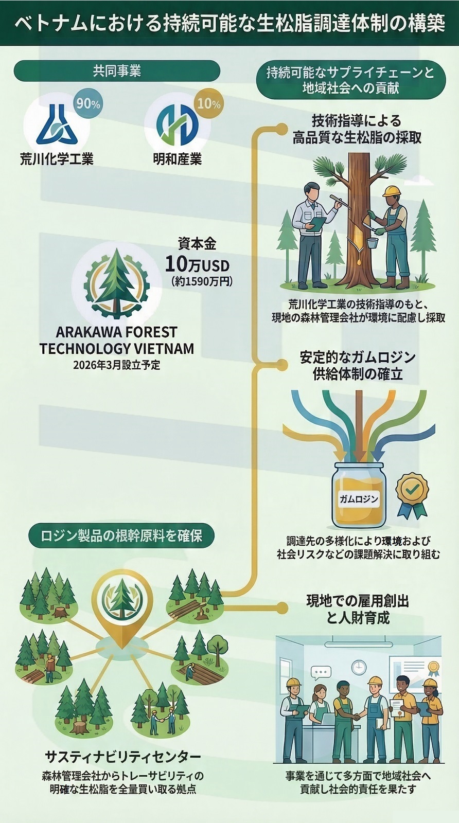 同社はロジン製品の需要に応えながら、調達先の多様化を通じた環境および社会リスクなどの課題解決に取り組んできた。その一環として、安定的かつ環境に配慮した生松脂の調達および持続的な森林経営を意識した事業の検討を重ねた結果、ベトナムで明和産業との共同事業化を見出し、今回の合弁会社設立に至った。