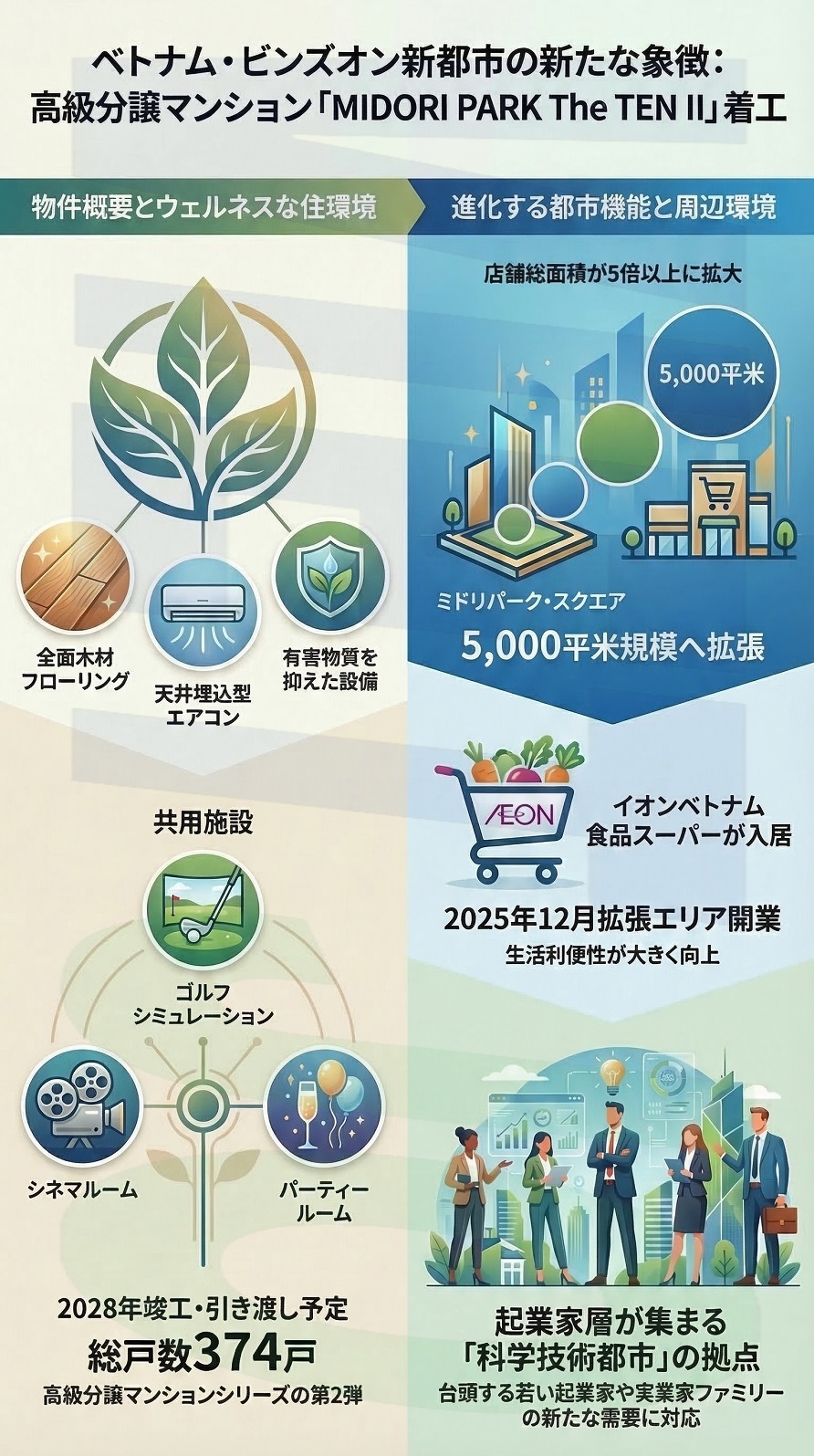 同物件が位置する「ミドリパーク(MIDORI PARK)」エリアでは、2025年12月に商業施設「ミドリパーク・スクエア(MIDORI PARK SQUARE)」の拡張エリアが開業し、店舗総面積が以前の5倍以上となる約5000m2へと拡大した。同施設にはイオン株式会社(千葉県千葉市)のベトナム法人であるイオンベトナム(AEON Vietnam)が運営する食品スーパーなどが入居し、生活の利便性が大きく高まっている。