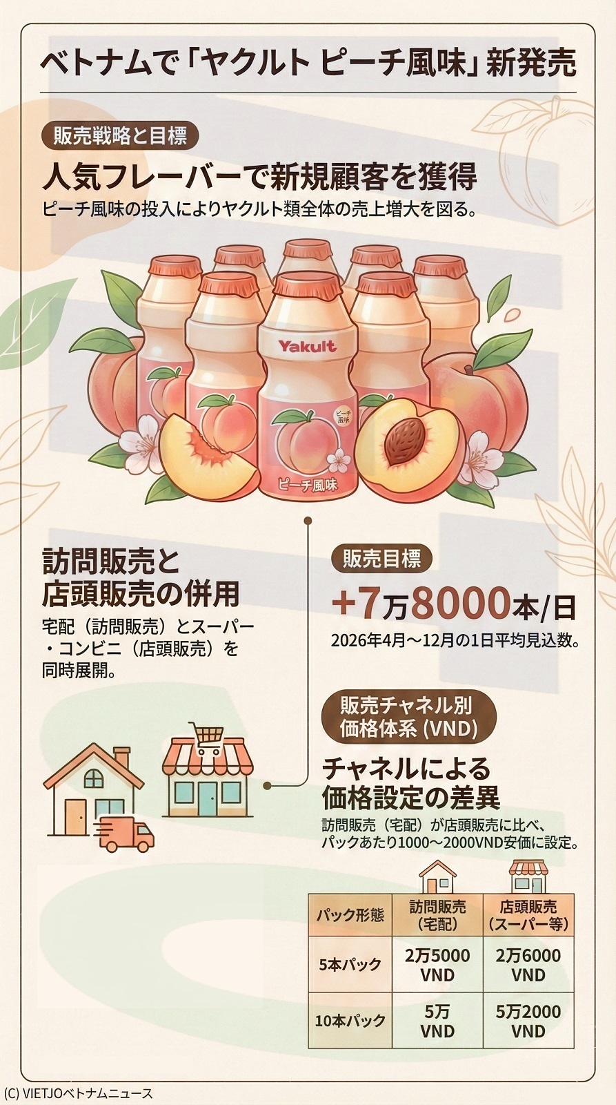 株式会社ヤクルト本社(東京都港区)の海外子会社であるベトナムヤクルト(ホーチミン市)は、4月1日に新商品「ヤクルト ピーチ風味」をベトナムで発売する。
