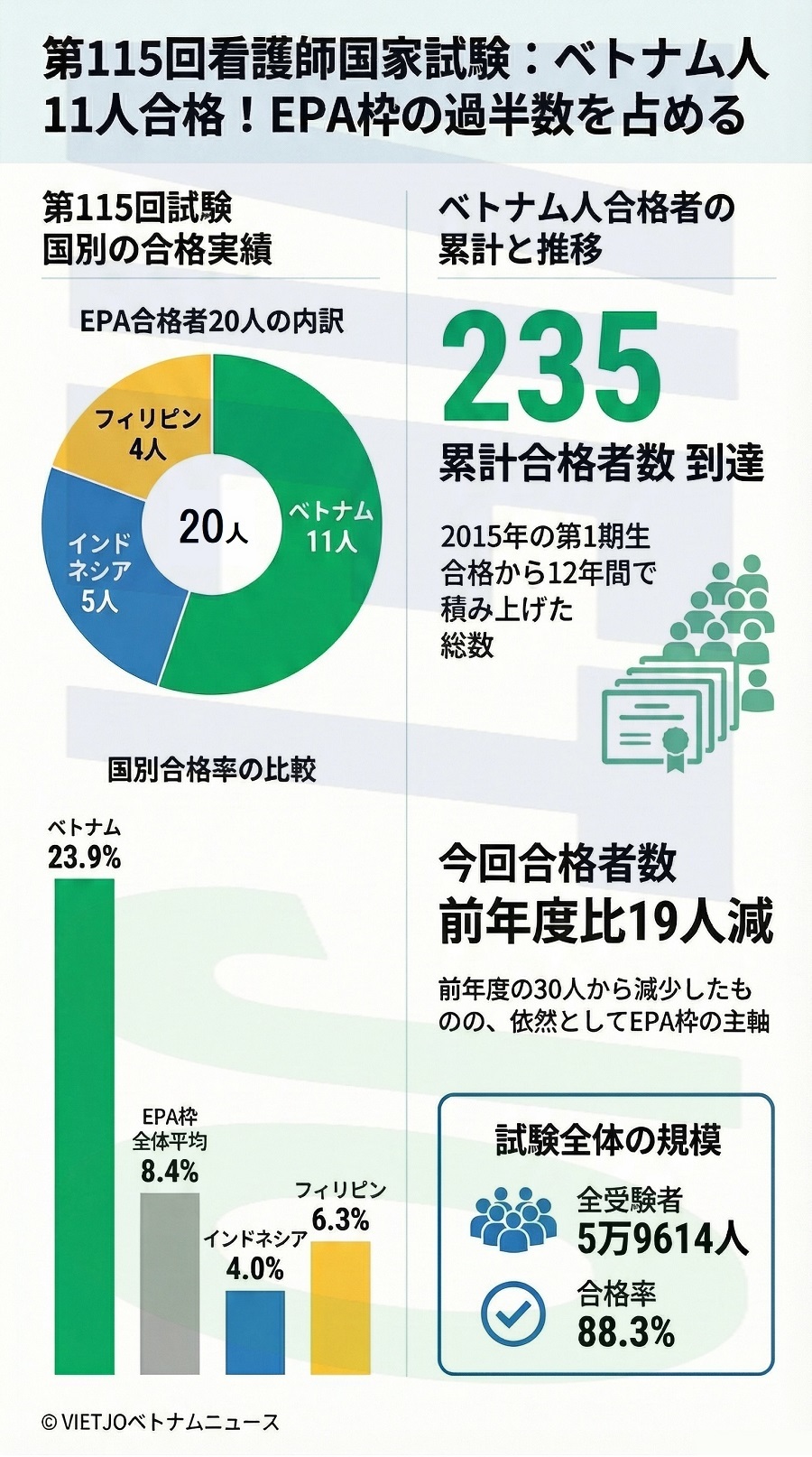 日本の厚生労働省は、第115回看護師国家試験における経済連携協定(EPA)に基づく外国人看護師候補者の結果を発表した。今回のEPA(ベトナム、フィリピン、インドネシア)枠全体の合格者は20人で、このうち11人がベトナム人だった。