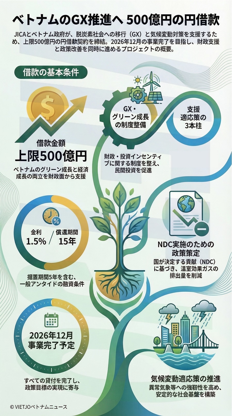 国際協力機構(JICA)はハノイ市で3月30日、ベトナム政府との間で、「グリーン成長および気候に対する強靭性のためのGXプログラムローン」を対象とする円借款貸付契約に調印した。借款金額は上限500億円となる。