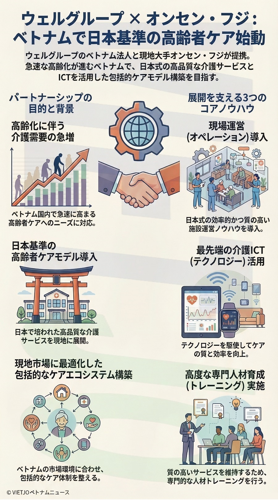 急速な高齢化が進むベトナムにおいて、質の高い介護サービスの需要が高まっている。今回の提携により、ウェルグループが長年にわたり日本で培ってきた「現場運営(オペレーション)」、「最先端の介護ICT(テクノロジー)」、「専門人材育成(トレーニング)」の3つのノウハウを統合し、これらを現地市場に最適化させることで、ベトナムにおける包括的なケアエコシステムの構築を目指す。