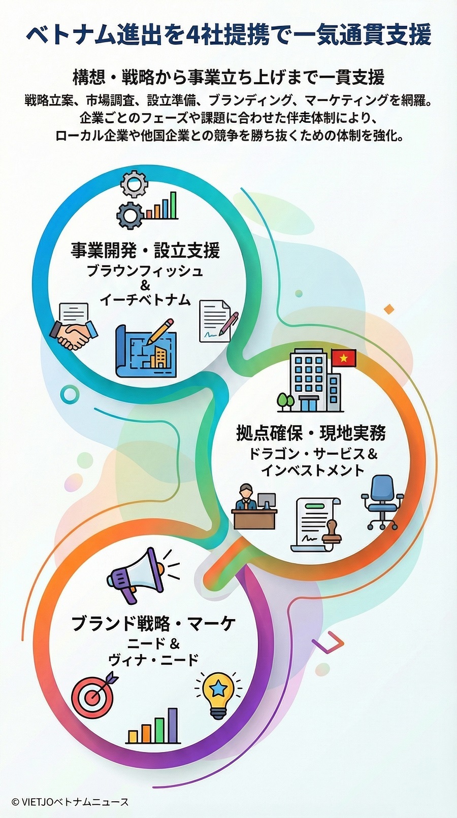さらに、事業開発支援などを担うブラウンフィッシュ(Brown Fish)と、会社設立やバックオフィス支援を行うイーチベトナム(EACH VIET NAM)が連携してワンストップ支援を行う。