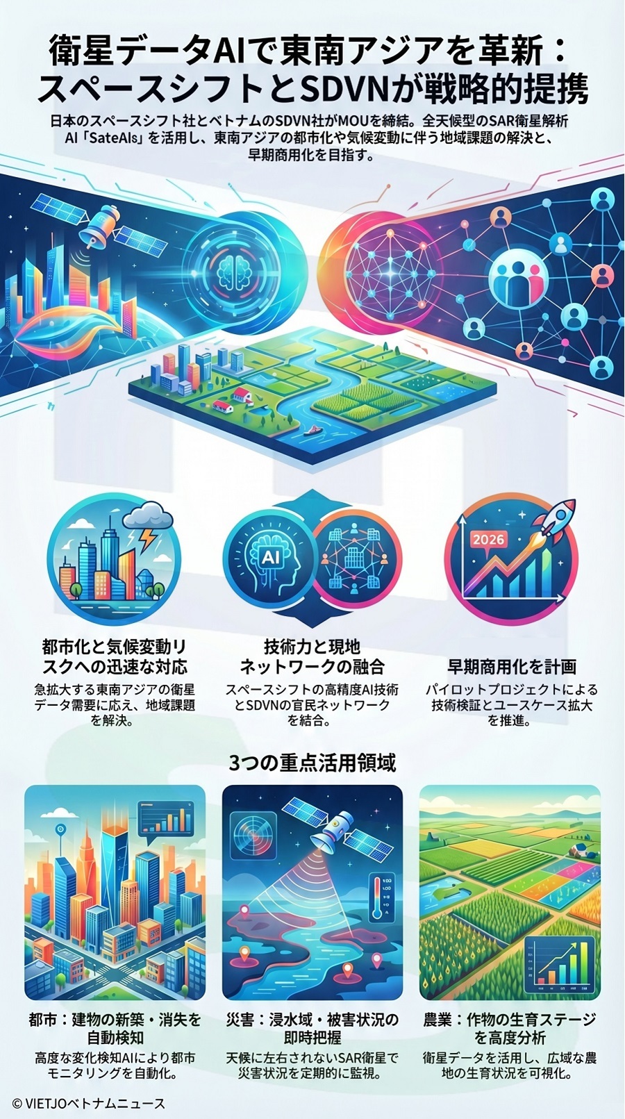 両社は、東南アジアにおける都市化や気候変動リスクの高まりを背景に、スペースシフトの衛星データ解析AIプロダクト「SateAIs(サテアイズ)」をベトナムおよび近隣諸国へ展開する。