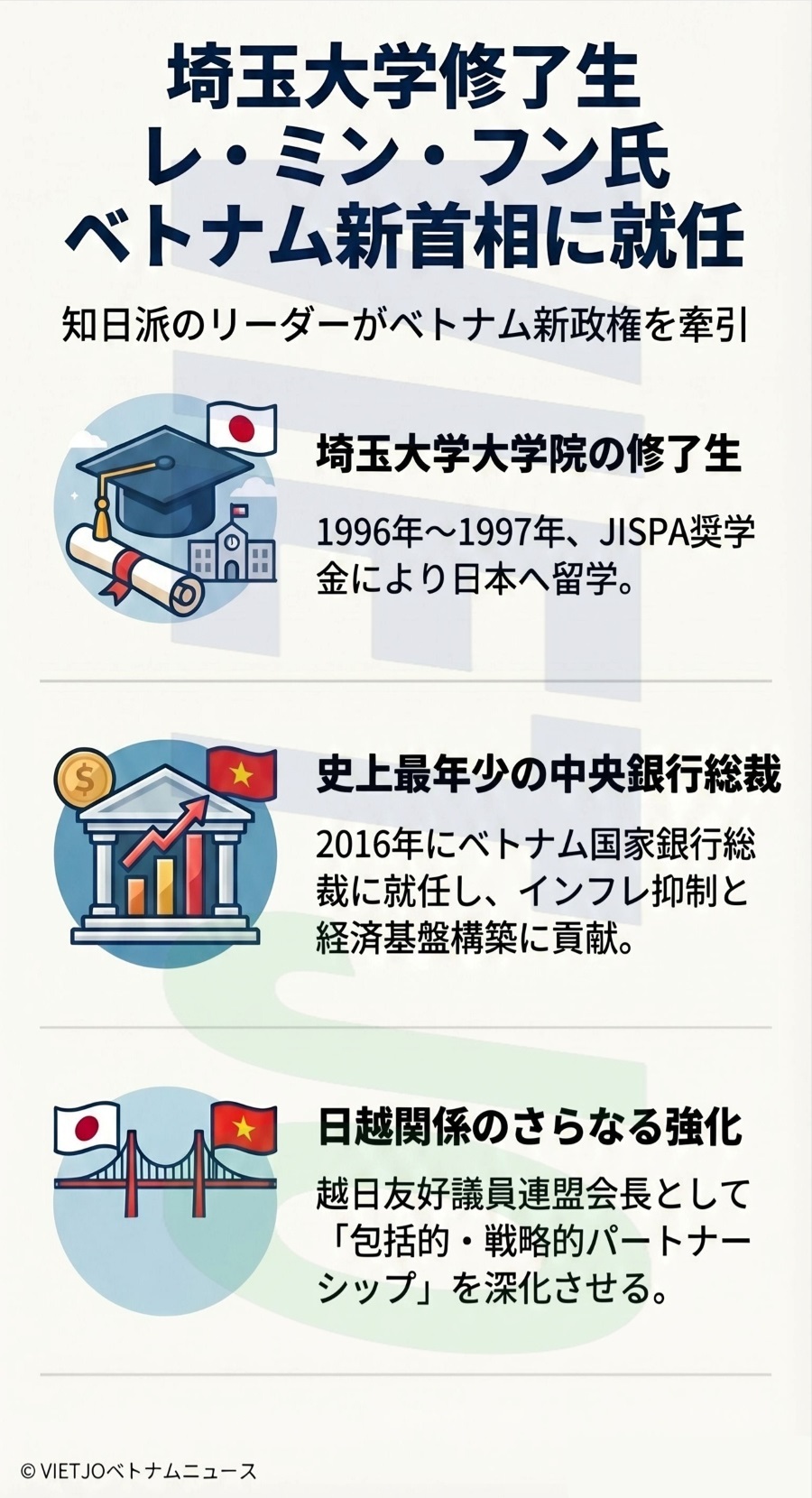 その後、党中央官房長官を経て、2024年からは党中央組織委員長および越日友好議員連盟会長を務め、今回の首相選出に至った。フン氏の父親はレ・ミン・フオン元内相・元公安相であり、新たな政権運営において、首相の卓越した手腕に注目が集まっている。