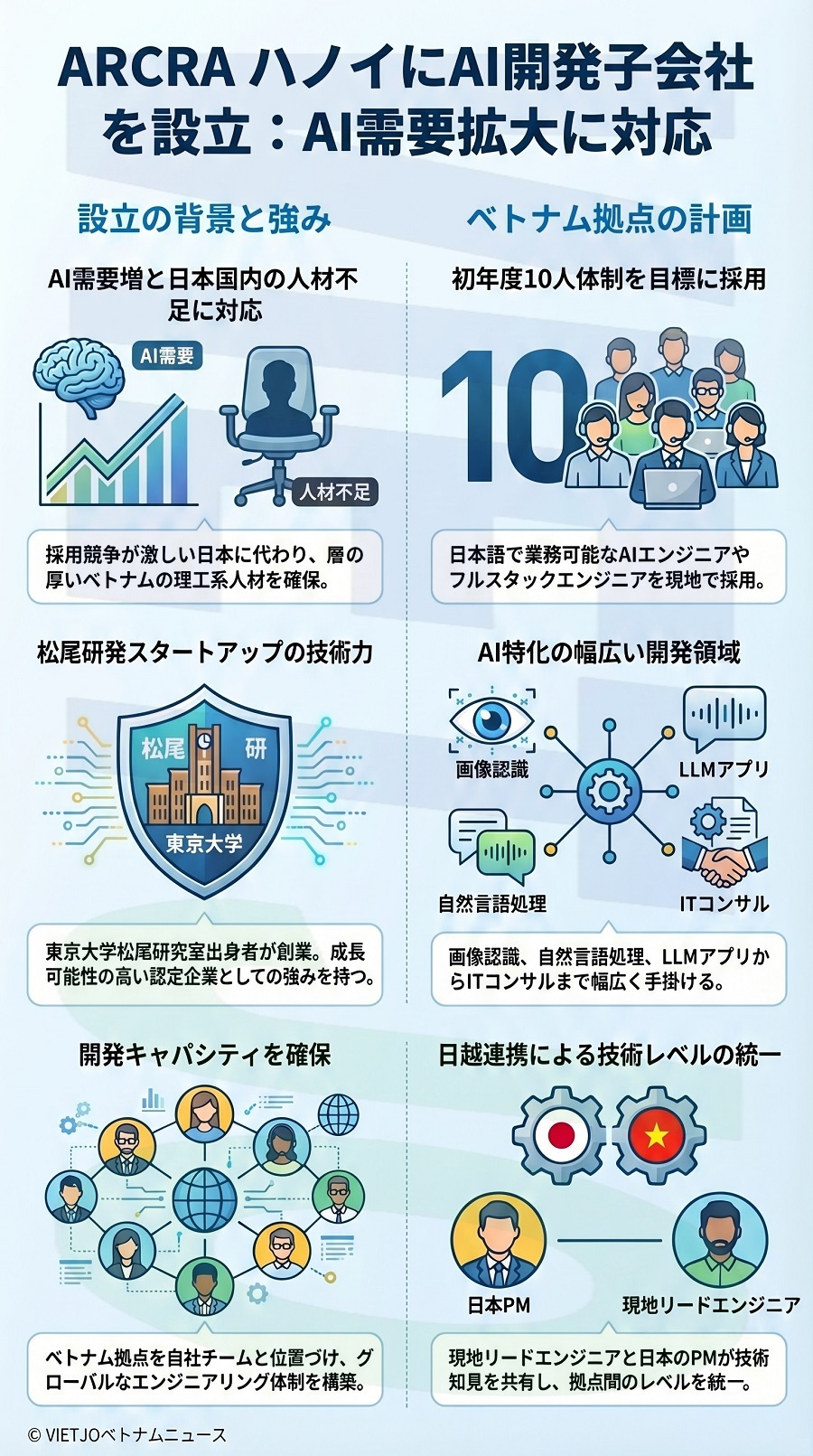 生成AIの実用化が進む中、AIシステムの設計や実装に関する開発依頼が増加している一方で、日本国内ではAI領域に対応できるエンジニアの採用競争が激化している。ARCRAは、理工系人材の層が厚く、日本企業との協業経験を持つ優秀なエンジニアが多く存在するベトナムに開発拠点を設けることで、案件増加に対する開発キャパシティの確保を図る。