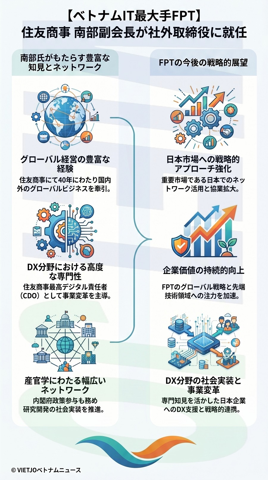 FPTにとって特に重要な海外市場の一つである日本において、南部氏が有するグローバル経営の経験やデジタルトランスフォーメーション(DX)分野における高度な専門性、幅広いネットワークを活かし、日本企業への戦略的アプローチの強化や協業の拡大に貢献することが期待されている。
