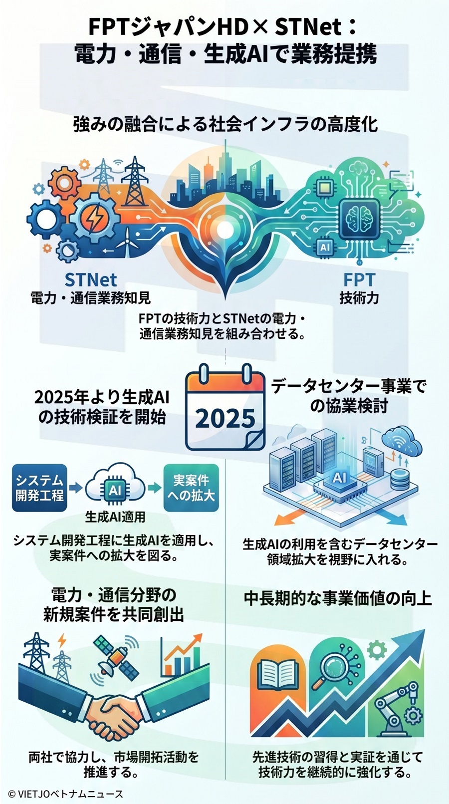 ベトナムのIT最大手FPT情報通信[FPT](FPT Corporation)傘下のFPTソフトウェア(FPT Software)の日本法人であるFPTジャパンホールディングス株式会社(東京都港区)と、四国電力グループの情報通信企業である株式会社STNet(香川県高松市)は3月25日付けで、電力および通信分野を中心とした社会インフラ領域における業務提携に関する基本合意書を締結した。
