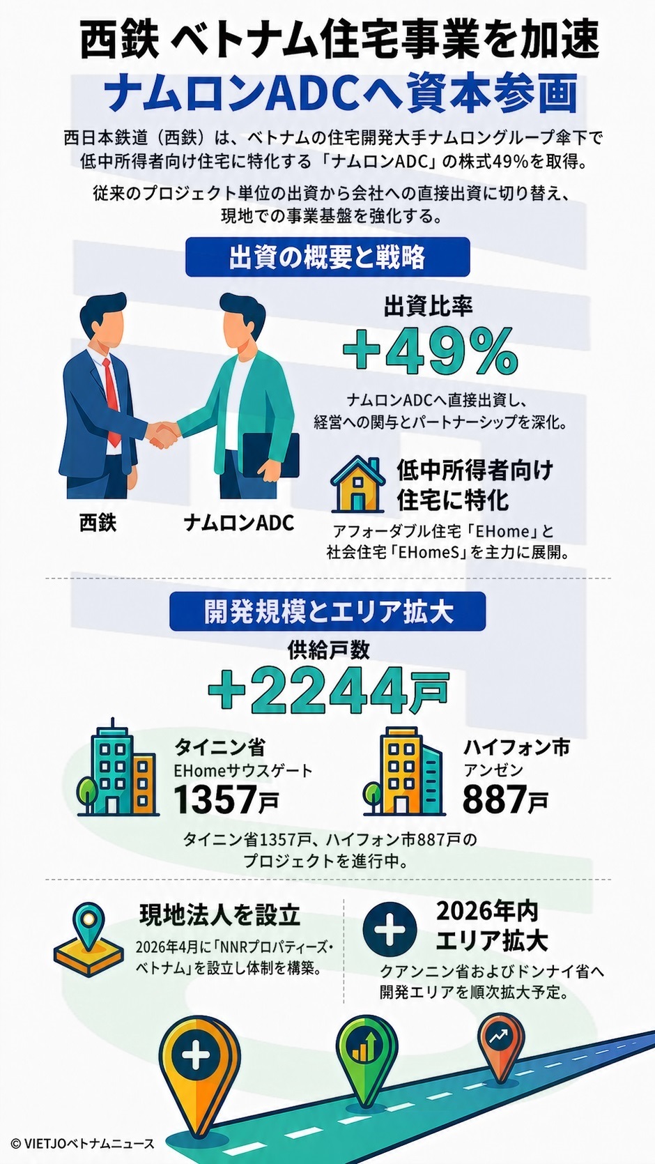 西日本鉄道株式会社(福岡県福岡市)は、住宅開発大手で特に中所得者向けのマンション開発に強みを持つナムロン投資[NLG](Nam Long Investment Corporation)グループで、中所得者向けのアフォーダブル住宅や低所得者向けの社会住宅の開発に特化するナムロン・アパートメント・デベロップメント(Nam Long Apartment Development=ナムロンADC)に出資し、ベトナムにおける住宅開発の領域を拡大する。