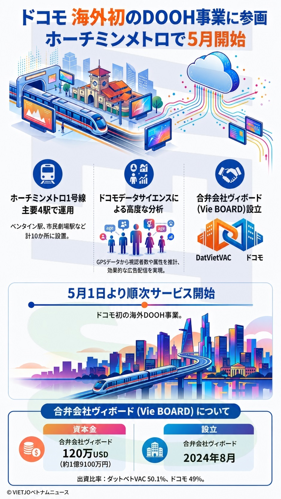 株式会社NTTドコモ(東京都千代田区)と、地場ダットベトグループ(Dat Viet Group)などの合弁会社であるヴィボード(Vie BOARD)は、ホーチミン市においてデジタル屋外広告(Digital Out of Home=DOOH)の運用を5月1日から順次開始する。NTTドコモにとって初の海外DOOH事業への参画となる。