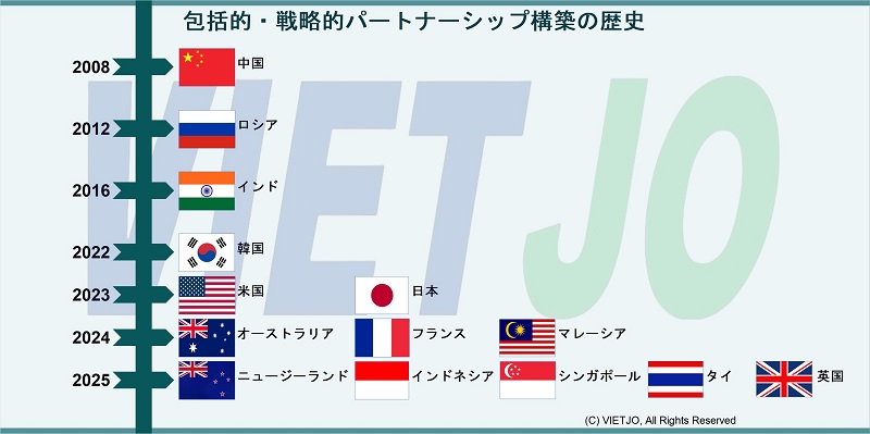 2025年10月30日現在、ベトナムと包括的・戦略的パートナーシップを結んでいる国は、◇中国(2008年)、◇ロシア(2012年)、◇インド(2016年)、◇韓国(2022年)、◇米国(2023年9月)、◇日本(2023年11月)、◇オーストラリア(2024年3月)、◇フランス(2024年10月)、◇マレーシア(2024年11月)、◇ニュージーランド(2025年2月)、◇インドネシア(2025年3月11日)、◇シンガポール(2025年3月12日)、◇タイ(2025年5月) 、◇英国(2025年10月)の14か国となっている。