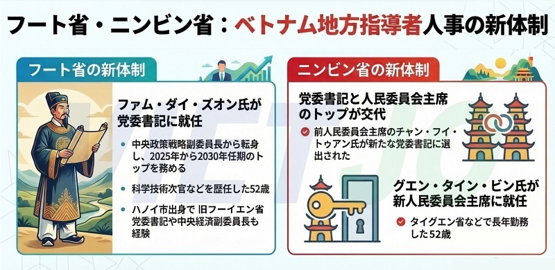 ベトナム共産党政治局は、北部地方フート省および北部紅河デルタ地方ニンビン省の重要人事を発表した。フート省共産党委員会書記にはファム・ダイ・ズオン中央政策戦略副委員長が就任し、ニンビン省でも共産党委員会書記と人民委員会主席の新たなトップが選出された。