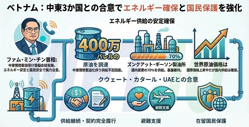 同日、首相はクウェート、アラブ首長国連邦(UAE)、カタールの首脳と相次いで電話会談を行い、エネルギー供給の継続や現地に滞在するベトナム人の安全確保について合意した。