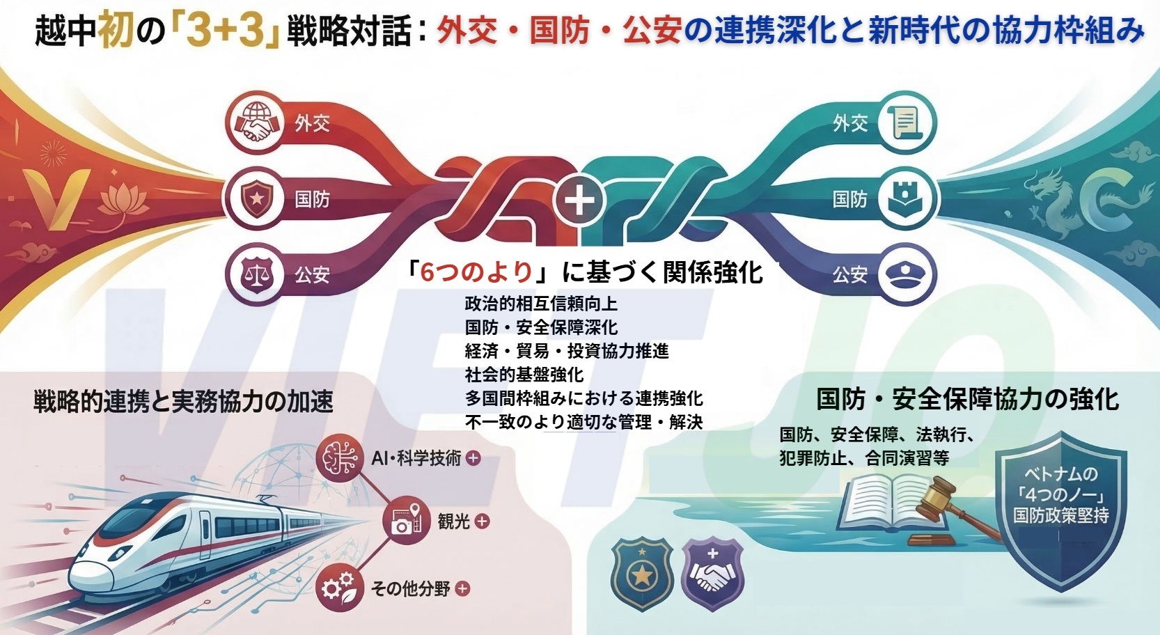 同日、ベトナムのレ・ホアイ・チュン外相、ファン・バン・ザン国防相、ルオン・タム・クアン公安相は、中国の3閣僚とともに第1回「3+3」戦略対話を共同主宰した。