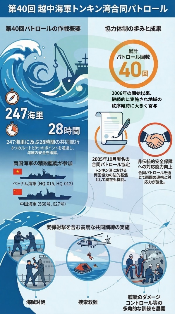 ベトナムと中国の海軍は、2005年10月にトンキン湾における合同パトロールに関する協定に署名した。2006年から現在に至るまで、両国は同海域で39回の合同パトロールと多数の共同訓練を継続的に実施してきた。この合同パトロールの仕組みは、同海域の安全と秩序の維持、および両国海軍間における非伝統的安全保障上の課題への対応能力の向上に寄与している。