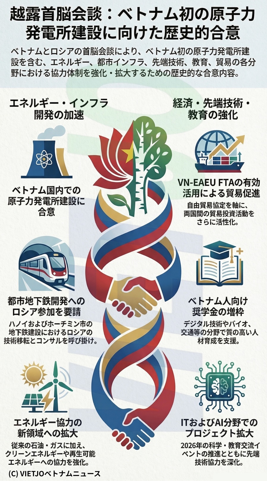 さらに、チン首相は、ハノイ市やホーチミン市での地下鉄システムの開発に向けたロシアからのコンサルティング、設計、技術移転、建設への参加を呼び掛けた。科学技術分野では、情報技術(IT)や人工知能(AI)などの潜在的なプロジェクトを拡大し、2026年に科学・教育に関する交流イベントを推進することで一致した。