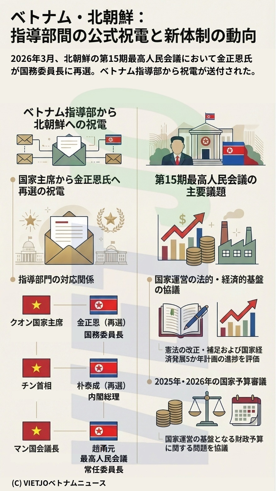 またこの機に、ファム・ミン・チン首相が内閣総理に再選された朴泰成(パク・テソン)氏に、チャン・タイン・マン国会議長が最高人民会議常任委員会委員長に選出された趙甬元(チョ・ヨンウォン)氏に、それぞれ祝電を送った。