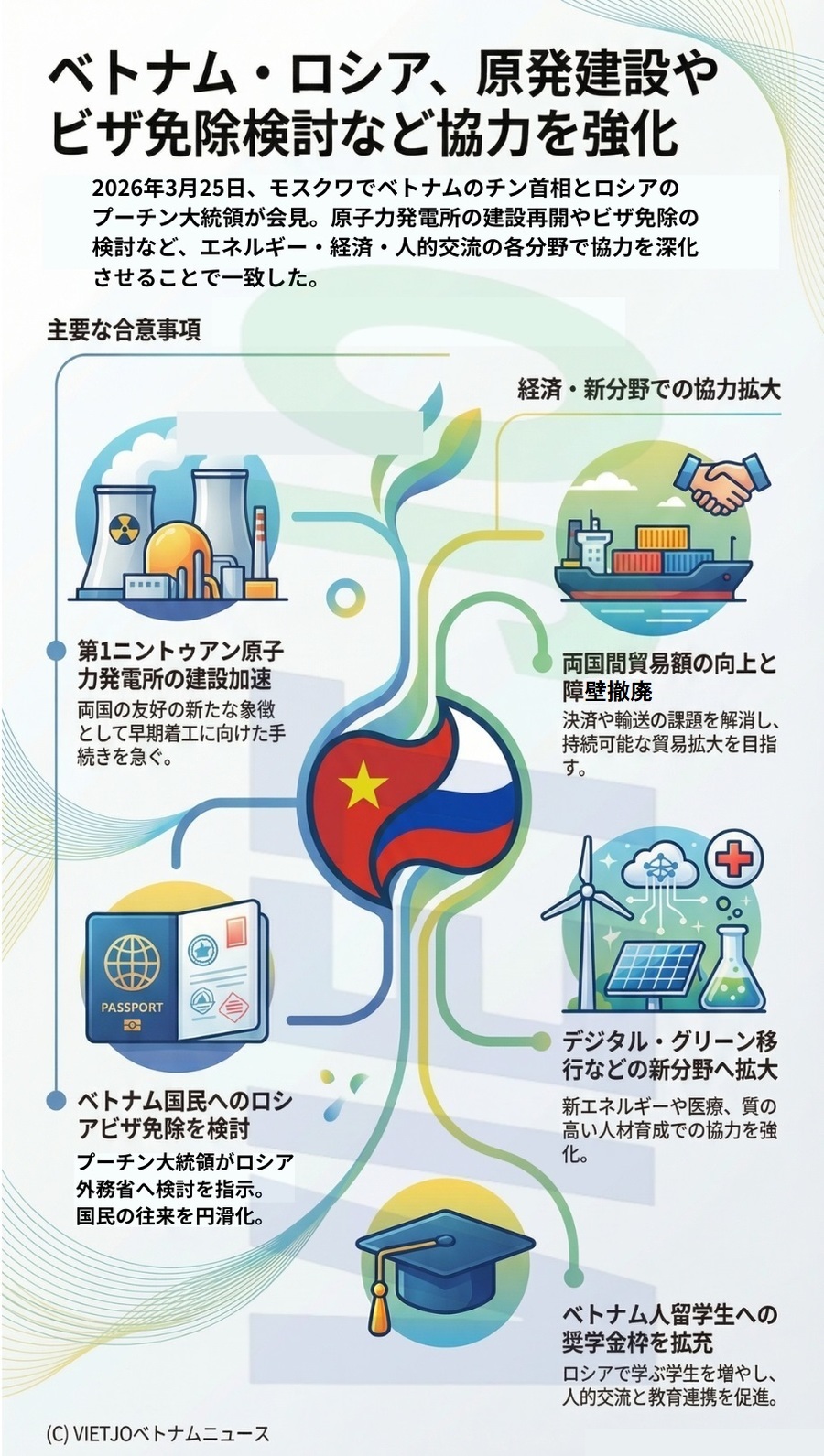 また、エネルギーや石油・ガス、科学技術、イノベーション、インフラ開発を重点分野と位置づけた。プーチン大統領は、ベトナムでの第1ニントゥアン原子力発電所の建設協定に関する交渉妥結に向けた両国の努力を評価し、同プロジェクトが新時代における両国友好の新たな象徴となるよう、早期の着工に向けてロシア政府へ早急に次のステップを展開するよう指示すると明言した。