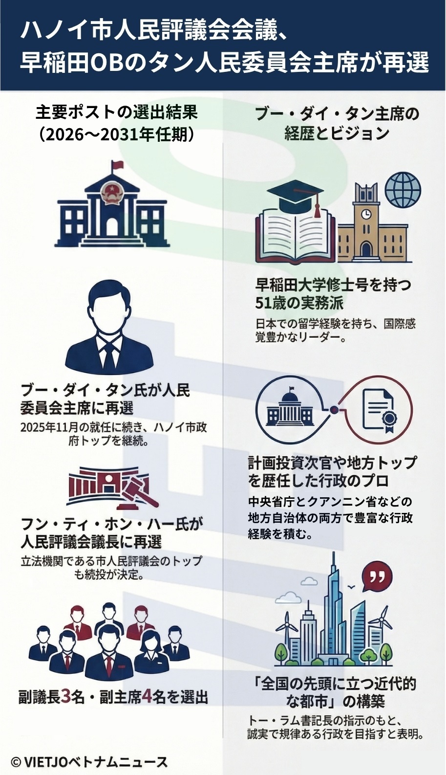 同会議では、ハノイ市人民評議会および人民委員会の主要ポストの選出が行われた。ハノイ市人民評議会副議長には、◇チャン・テー・クオン氏、◇ファム・クイ・ティエン氏、◇ファム・ティ・タイン・マイ氏の3人が再選した。