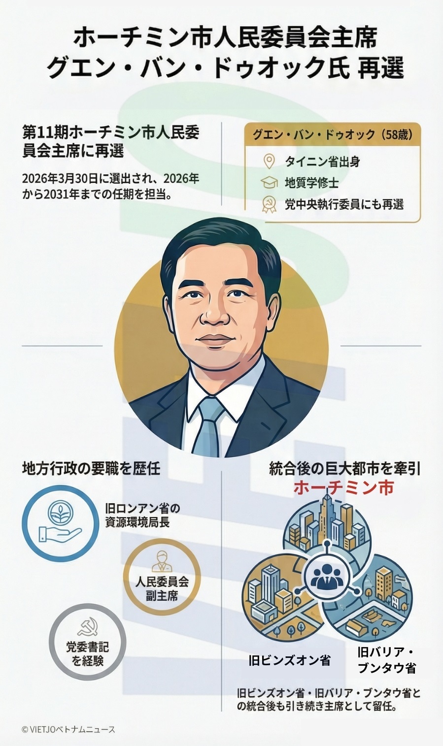 30日に開催された第11期(2026~2031年任期)ホーチミン市人民評議会の第1回会議で、グエン・バン・ドゥオック氏が同市人民委員会主席に再選された。ドゥオック氏は1968年生まれの58歳。南部地方タイニン省の出身で、地質学修士の学位を有する。