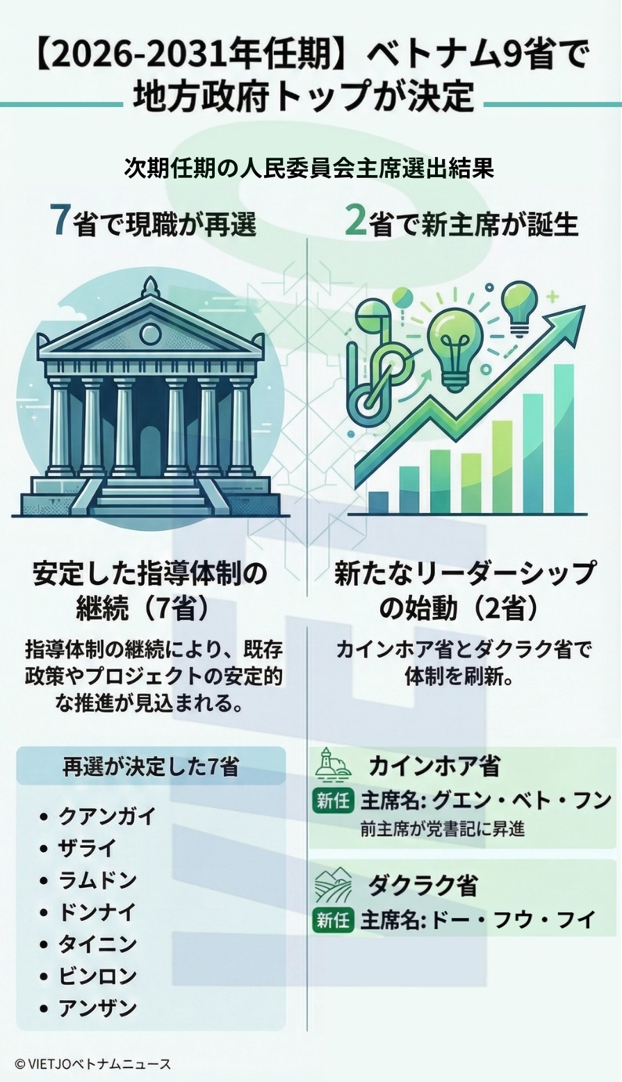今回の各省の人民評議会会議では、人民委員会主席の選出に加え、副主席や人民評議会議長・副議長、各委員会委員などの主要ポストの人事も決定され、2026~2031年の新任期に向けた各地方の指導体制が整えられた。