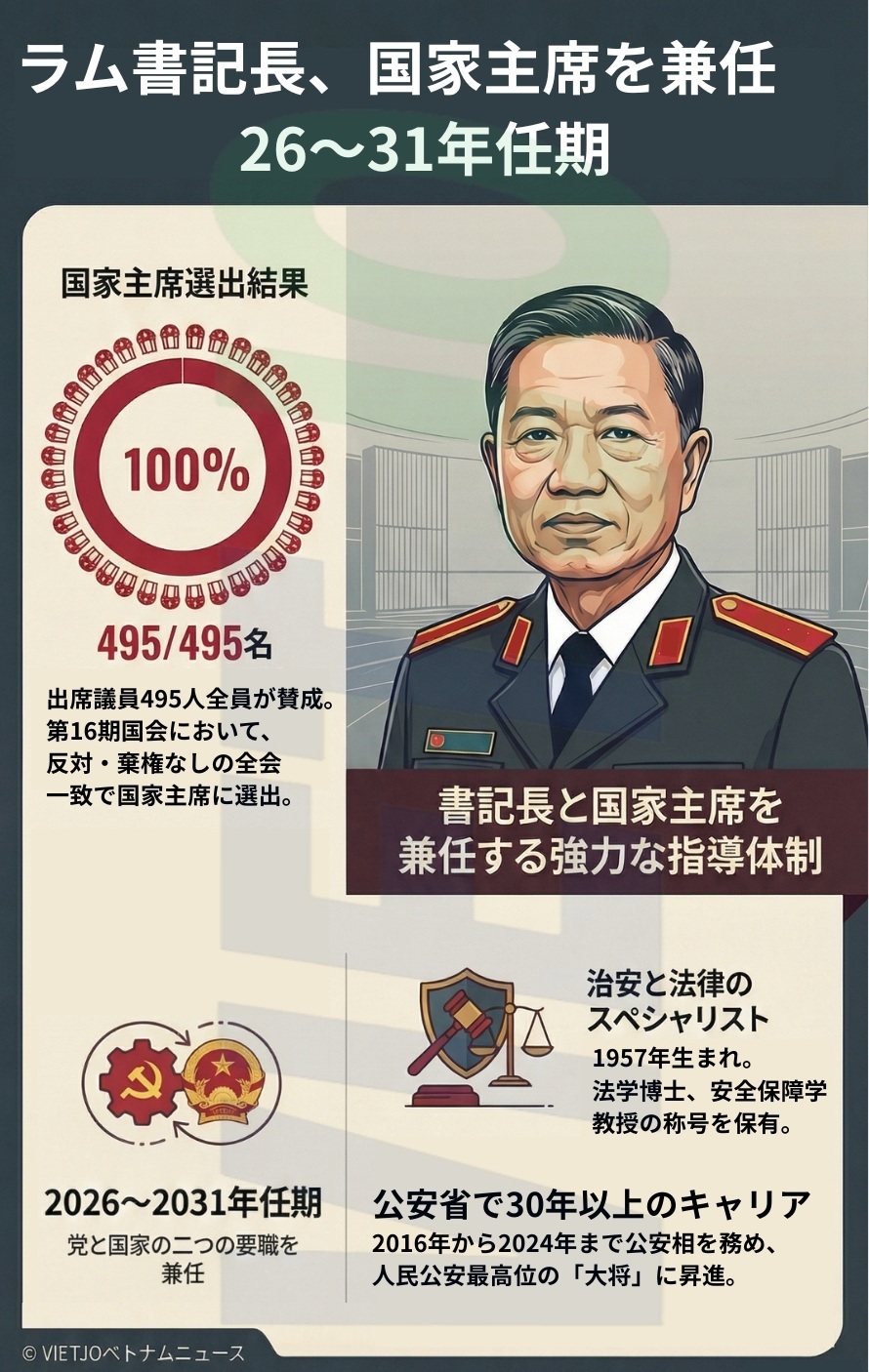 ラム氏が国家主席に選出されるのは、今回が2度目となる。これに先立ち、2024年5月に開催された第15期国会(2021〜2026年任期)第7回会議で、同任期の国家主席に初めて選出された。その後、同年8月には第13期ベトナム共産党中央執行委員会により書記長に選出され、10月まで書記長と国家主席を兼任していた。