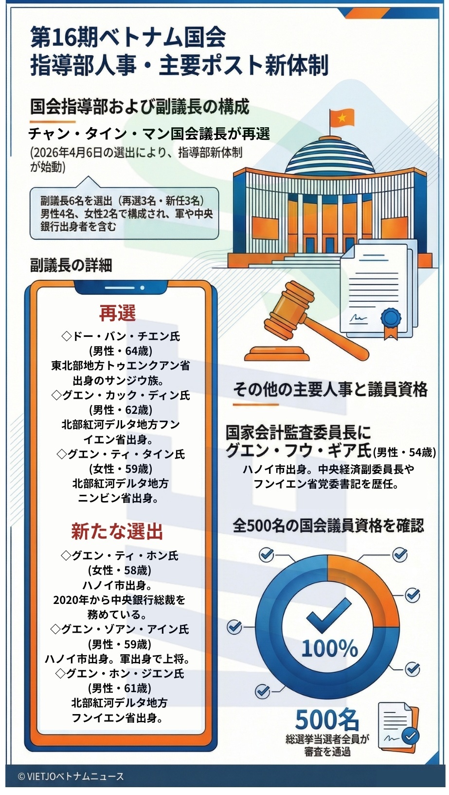 ◇グエン・カック・ディン氏(男性・62歳)※:北部紅河デルタ地方フンイエン省出身。前任期から国会副議長を続投。政府官房副長官、国会法律委員長、旧カインホア省共産党委員会書記などを歴任した。
