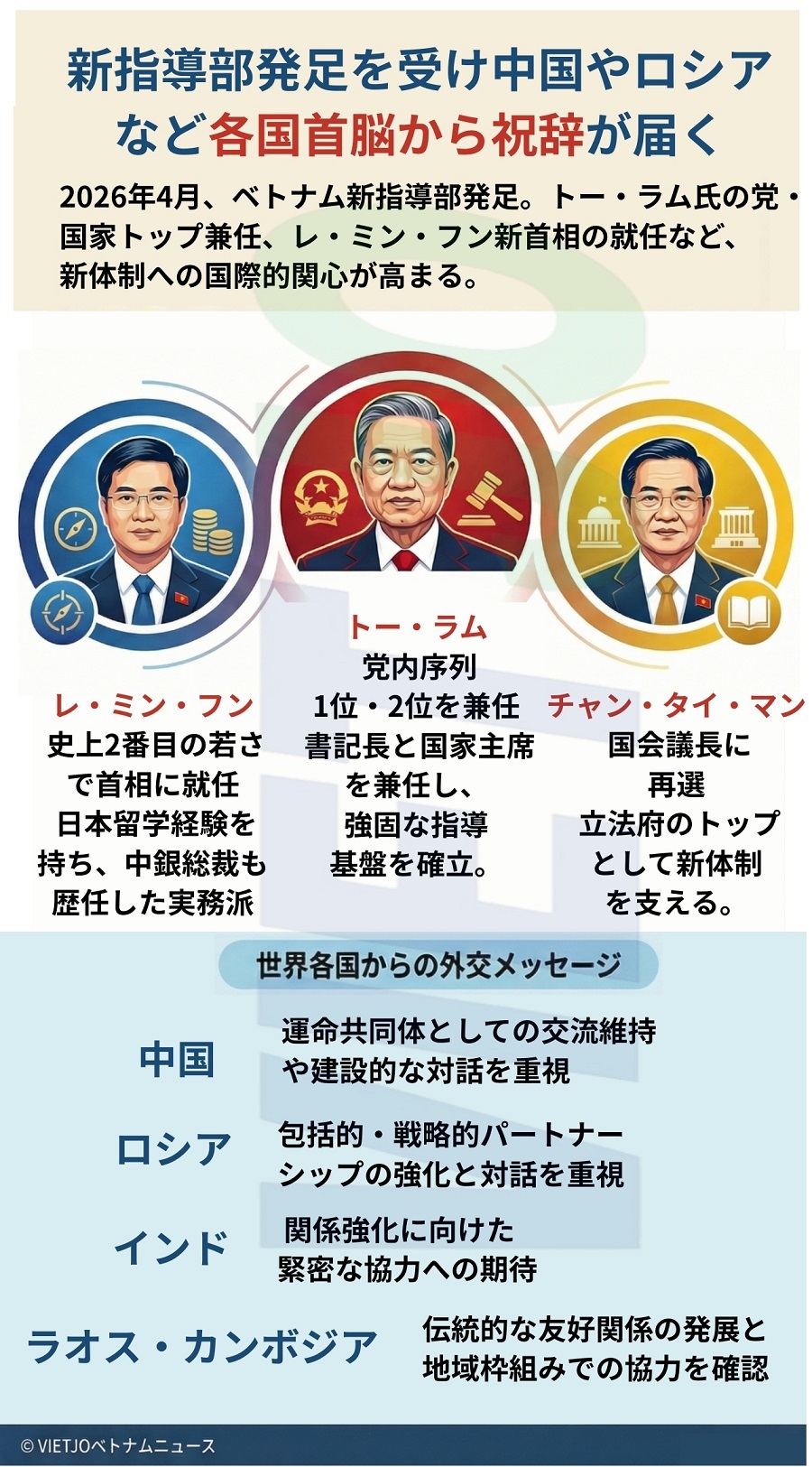 ベトナム共産党のトー・ラム書記長が国家主席に、レ・ミン・フン氏が首相に、チャン・タイン・マン氏が国会議長に選出された新体制の発足を受け、7日に中国、ロシア、インド、ラオス、カンボジア、キューバなどの各国の首脳から祝電やメッセージが相次いで送られた。