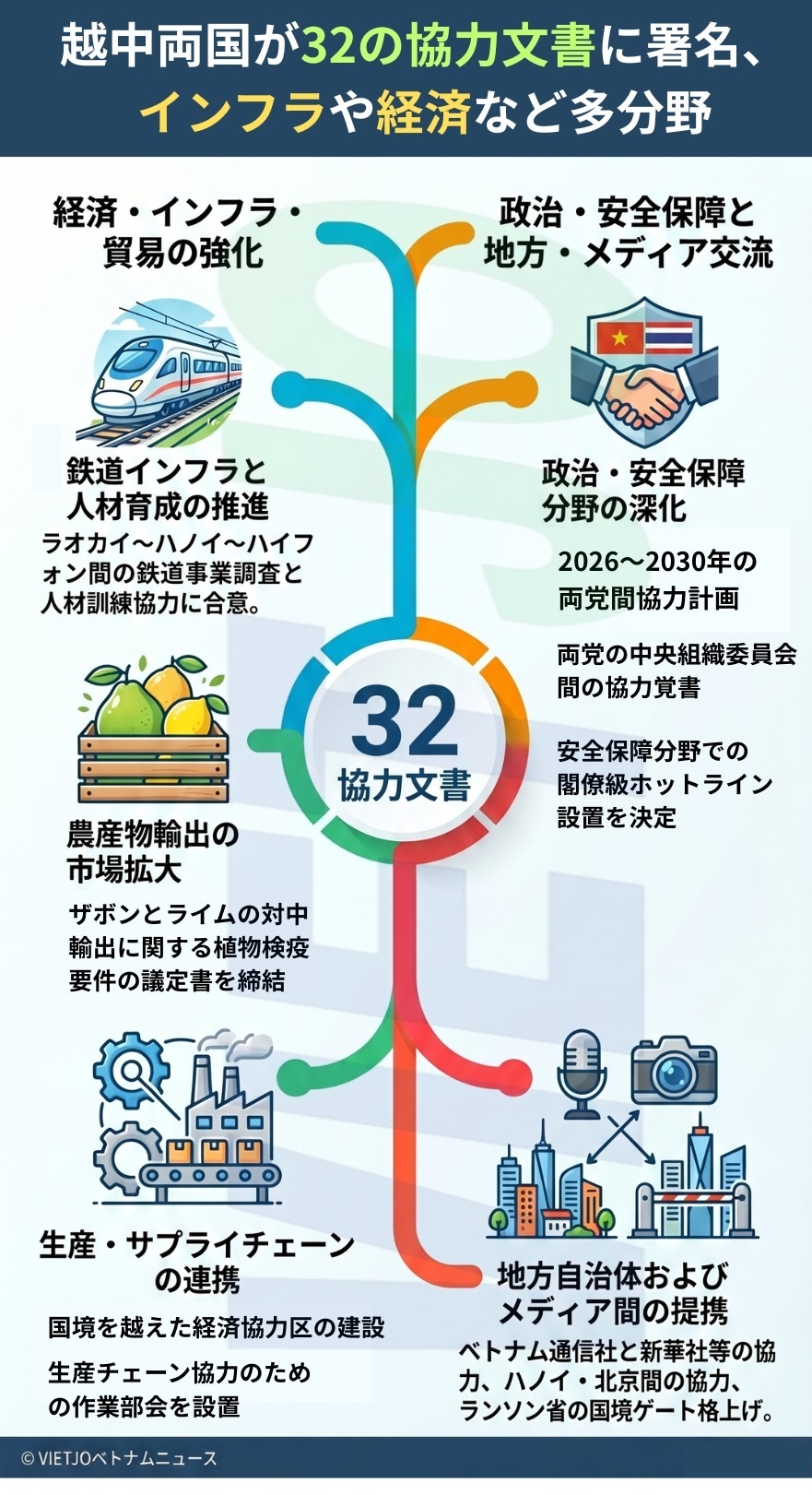 地方間では、ハノイ市と北京市が2026~2030年期の協力覚書に署名したほか、東北部地方ランソン省人民委員会と中国広西チワン族自治区人民政府がチーマー・爱店国境検問所の国際国境検問所への格上げに関する覚書を取り交わした。