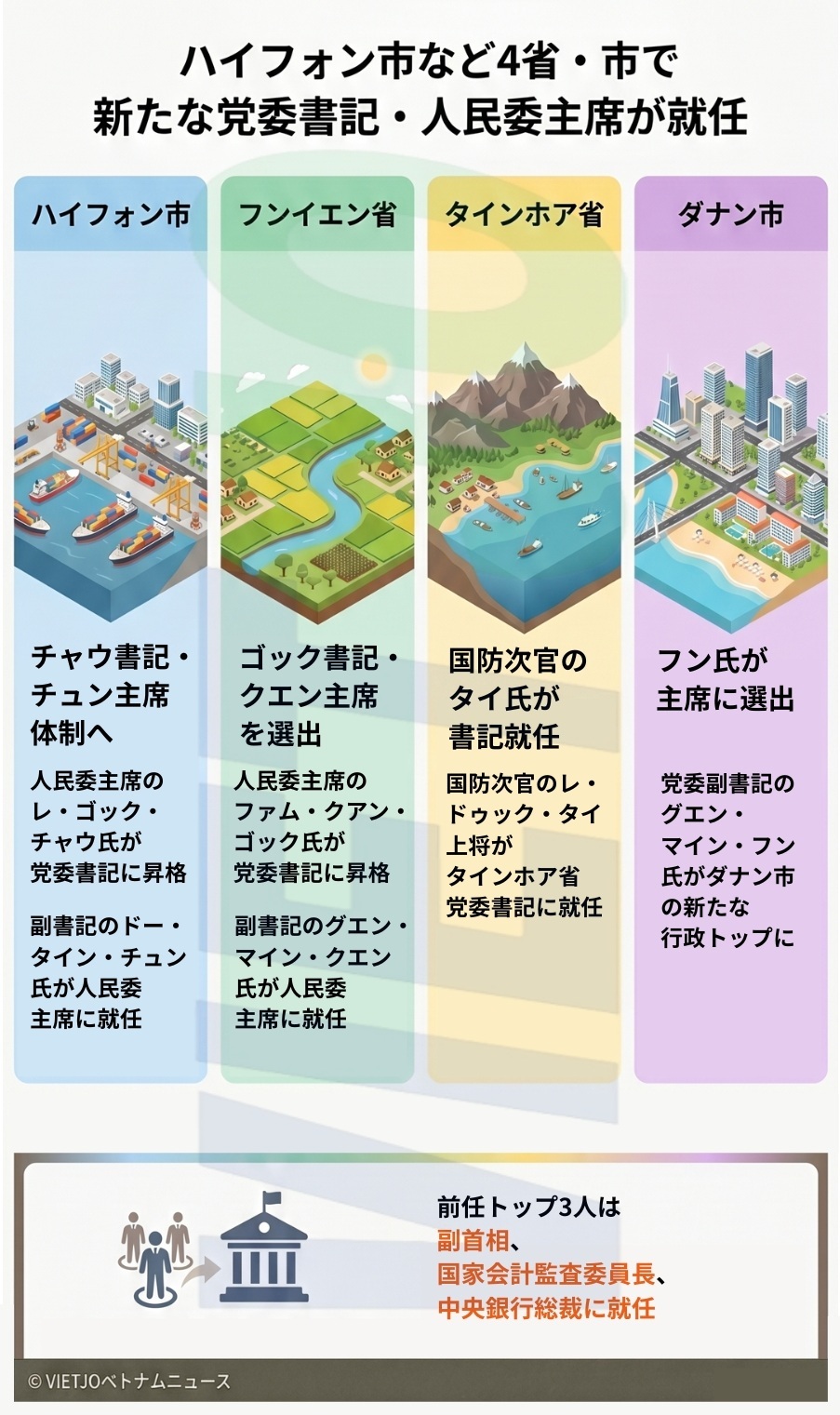 このほど、◇北部紅河デルタ地方ハイフォン市、◇同地方フンイエン省、◇北中部地方タインホア省、◇南中部地方ダナン市の4省・市で、新たな共産党委員会書記や人民委員会主席の主要人事が相次いで決定した。