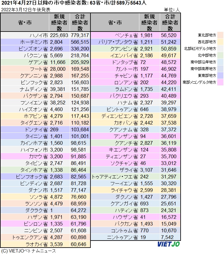 また12日、ハノイ市と北部紅河デルタ地方ナムディン省、同フンイエン省、東北部地方フート省で前日までに感染が確認されていた計28万5493人(◇ハノイ市:19万5000人、◇ナムディン省:3万5949人、◇フンイエン省:3万3760人、◇フート省:2万0784人)が新たに感染者数に追加された。これを合わせると、保健省が12日に発表した市中感染者数は計45万4197人となる。