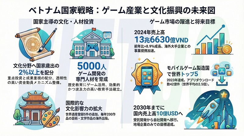 政府は「文化芸術人材育成国家戦略」を策定し、歴史教育に活用するゲーム開発の専門人材5000人を育成するプログラムを実施する。ビン副首相は、ゲームを通じた歴史教育は効果的で波及力の高い手法だと強調した。