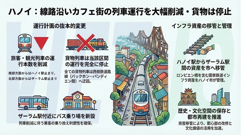 観光スポットとなっている線路沿いカフェ街を含むハノイ市の市街地を走るハノイ~ザーラム区間の運行計画に関し、双方は同区間における旅客列車と観光列車の本数を削減することで一致した。南部方面からの列車はハノイ駅止まりとし、北部方面からの列車はザーラム駅止まりとする。市は、ザーラム車両工場付近にバス乗り場を新設し、乗客の乗り換えに対応する。