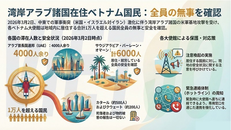 また、駐サウジアラビア・ベトナム大使館(バーレーンとオマーンも管轄)によると、3か国には計約6000人のベトナム国民が居住・就労しており、2日午後時点で全員の安全が確認されている。