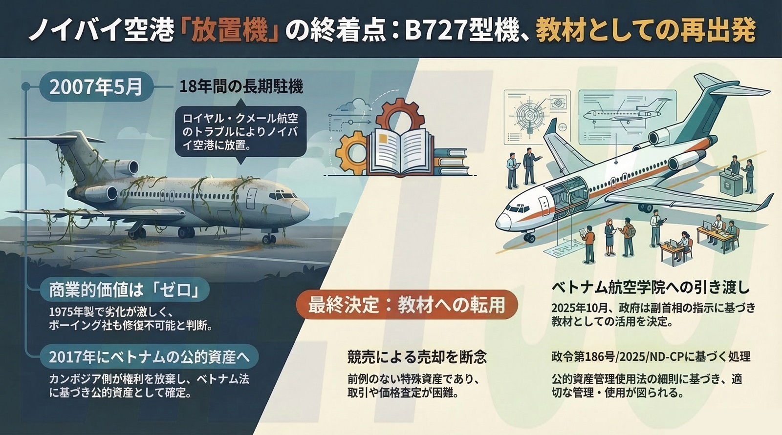 同機は、すでに建設省傘下ベトナム航空局(CAAV)に処理が委ねられていたが、今回、公的資産管理使用法の一部細則を規定した政令第186号/2025/ND-CPに基づき、同資産をベトナム航空学院に引き渡し、教材として管理・使用させることとなった。