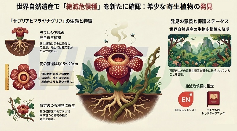 北中部地方クアンチ省のフォンニャ・ケバン国立公園でこのほど、厳正保護区内において希少な寄生植物である「サプリアヒマラヤナグリフ(学名:Sapria himalayana Griff)」の存在が確認された。今回の発見は、世界自然遺産である同国立公園の生物多様性に関する科学的なデータを補完するものとして注目されている。