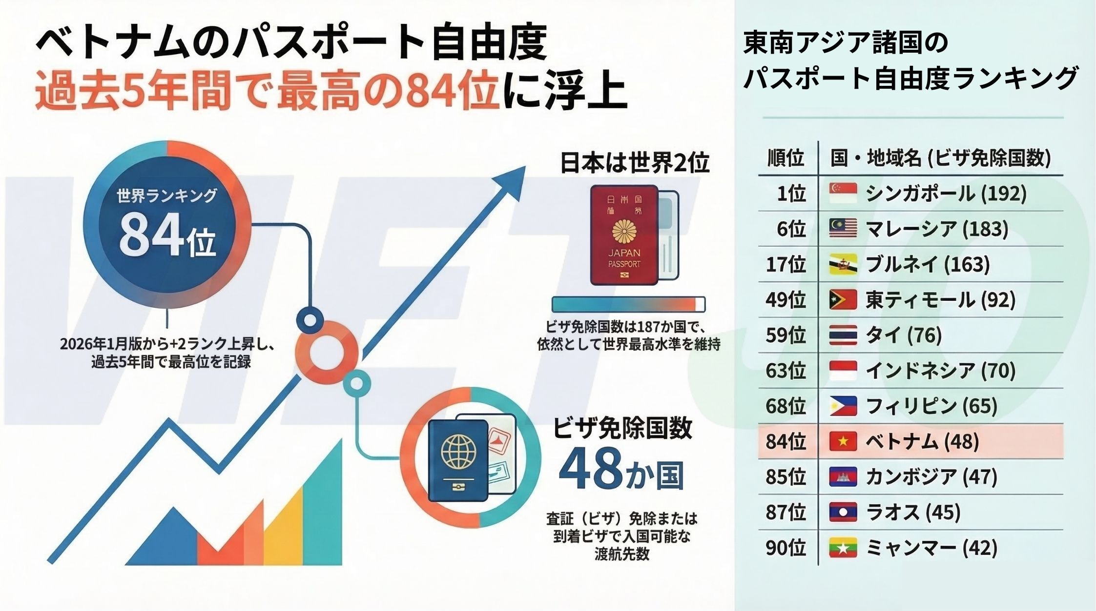 ベトナムのパスポートのビザ免除国数は48か国で、2026年1月版のランキングから2ランク上昇し、過去5年間で最高となる84位に浮上した。なお、世界1位はシンガポールのビザ免除国数192か国で変わらず、日本はビザ免除国数が187か国で世界2位につけている。