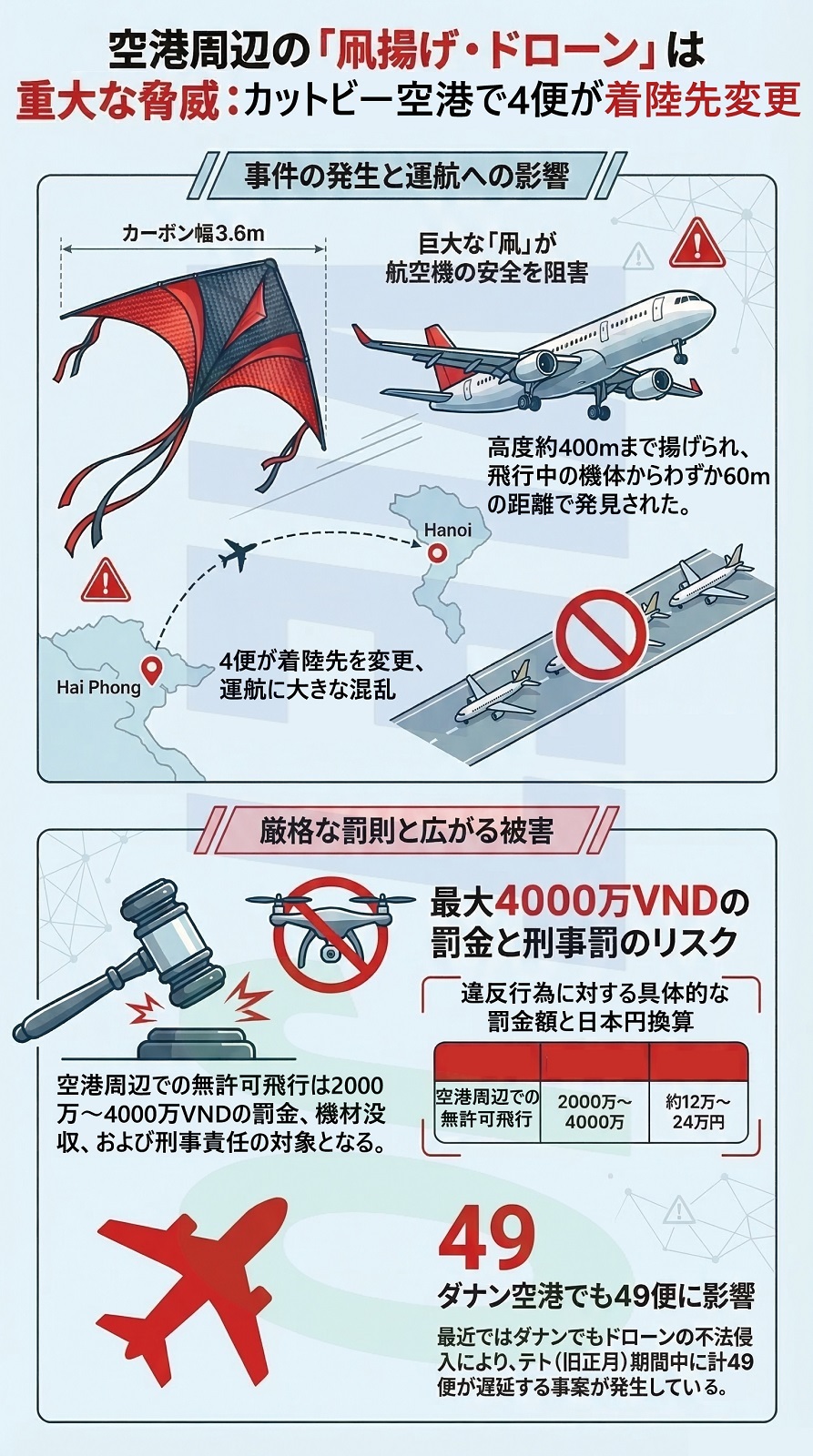 建設省傘下ベトナム航空局(CAAV)の代表者は、一瞬の違反が乗客の安全を脅かし、多大な損害を与えると警告した。未許可でドローンや凧などを空港周辺で飛ばした場合は2000万~4000万VND(約12万~24万円)の罰金や機材没収の対象となり、深刻な事態を招いた場合は刑事責任を問われる可能性がある。