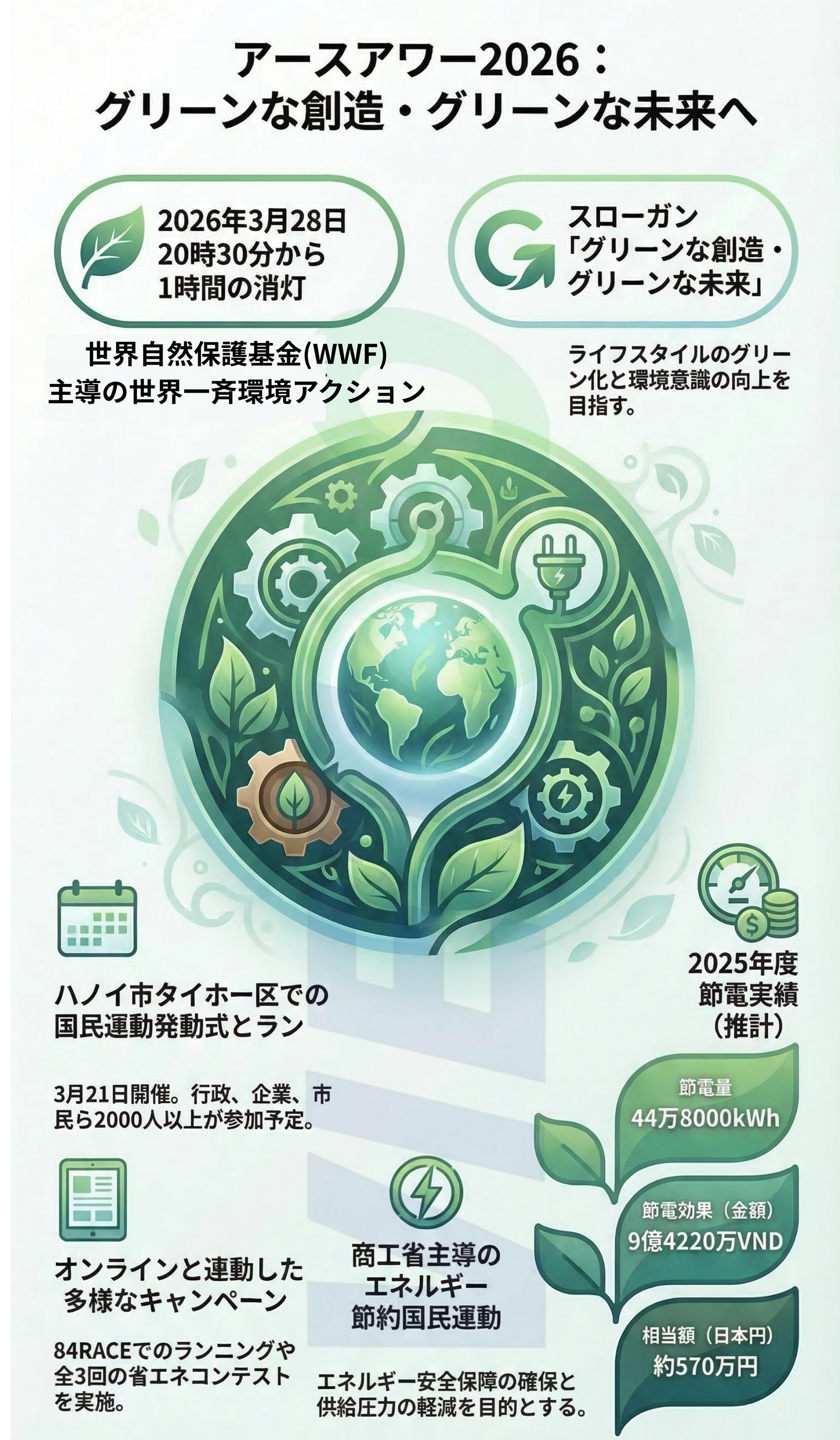 なお、2025年にベトナムで実施された同イベントでは、1時間の消灯により44万8000kWhの電力が節約され、約9億4220万VND(約570万円)相当の節電効果があった。