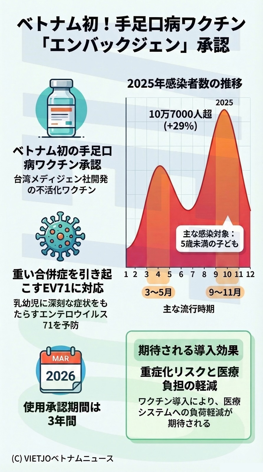 保健省医薬品管理局は17日付けで、台湾製の手足口病ワクチン「エンバックジェン(Envacgen)」の使用を承認した。ベトナムで初めて承認された手足口病ワクチンとなる。