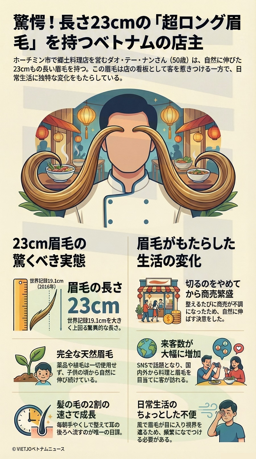 ホーチミン市フート街区ルーザー(Lu Gia)通りにある郷土料理店の店主が、奇妙な眉毛で注目を集めている。眉毛が、まるで髪の毛のように長いのだ。