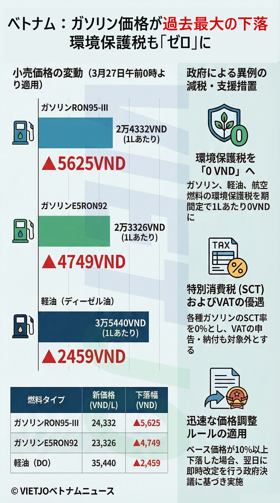 政府が19日に公布した決議第55号/NQ-CPにより、直近の改定時からベース価格が▲10%以上下落、または+15%以上上昇した場合には、商工省および財政省は翌日に直ちに価格調整を行うこととなっている。中東情勢などの影響で一時ガソリンRON95が1L当たり3万VND(約182円)を突破し、生活や生産コストを圧迫していたが、直近でのベース価格の▲10%超の下落により、国民生活への影響を緩和するため迅速な価格調整が実施された形だ。