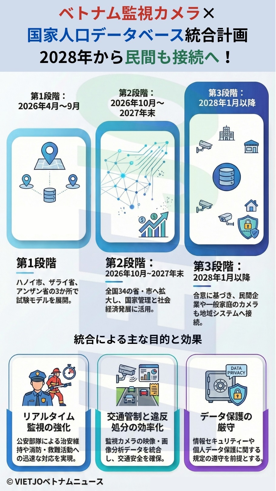 続く第2段階は2026年10月1日~2027年12月31日に実施され、監視カメラシステムを統合し、国家人口データベースとの接続やスマートシティ監視・運営センターへのデータ共有を行い、全国34の省・市において治安確保および社会経済発展に向けた国家管理に役立てる。
