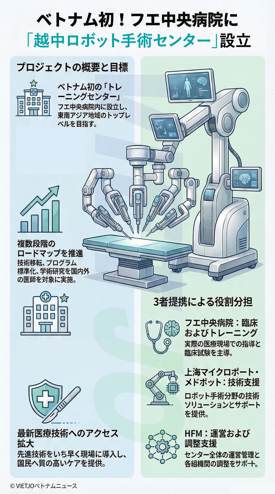 合意によると、フエ中央病院内に高度なロボット手術のトレーニングセンターを建設する。役割分担として、フエ中央病院が臨床およびトレーニングを担い、上海マイクロポート・メドボットがロボット手術分野の技術ソリューションと技術サポートを提供し、HFMがセンターの運営と調整を支援する。