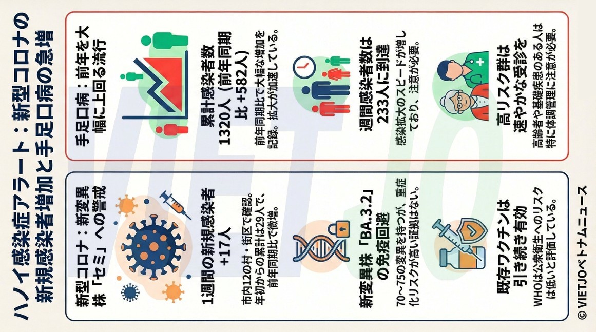 なお、ハノイ市では新型コロナに加えて、手足口病の感染者も増加傾向にある。過去1週間で前週から+46人増の233人が手足口病に感染したと報告された。2026年初めからの累計感染者数は1320人に達し、前年同期比で+582人の大幅な増加となっている。保健当局は、各地域の医療ステーションを通じた監視を強化し、発生地域の封じ込めと迅速な対応を実施して感染拡大の防止に努めている。