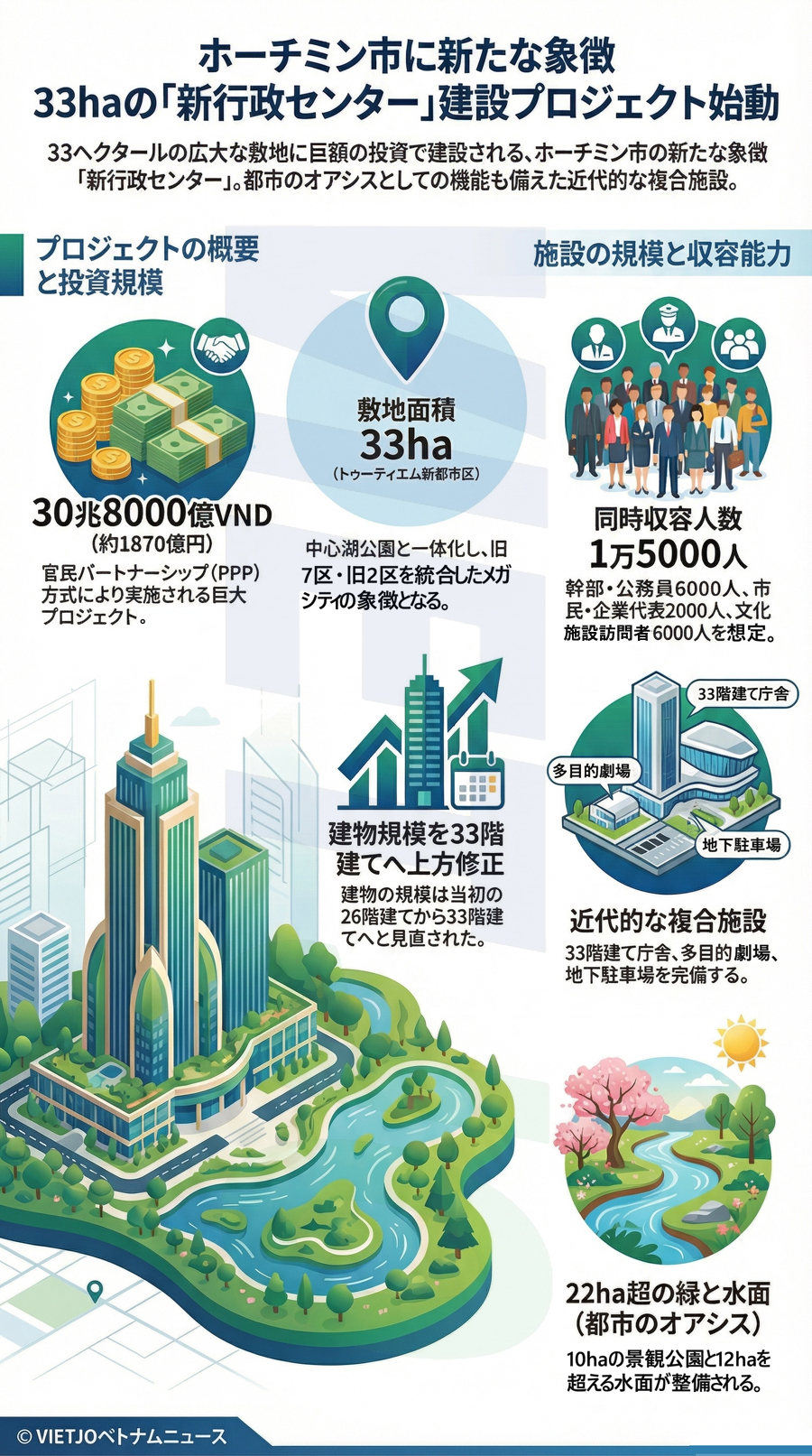 同市建設局によると、プロジェクトの投資総額は約30兆8000億VND(約1870億円)に上り、投資家の提案による官民パートナーシップ(PPP)方式で実施される。敷地内には、高さ33階建ての行政センター、多目的劇場、約10haの景観公園、12ha超の水面、地下駐車場などが整備される。