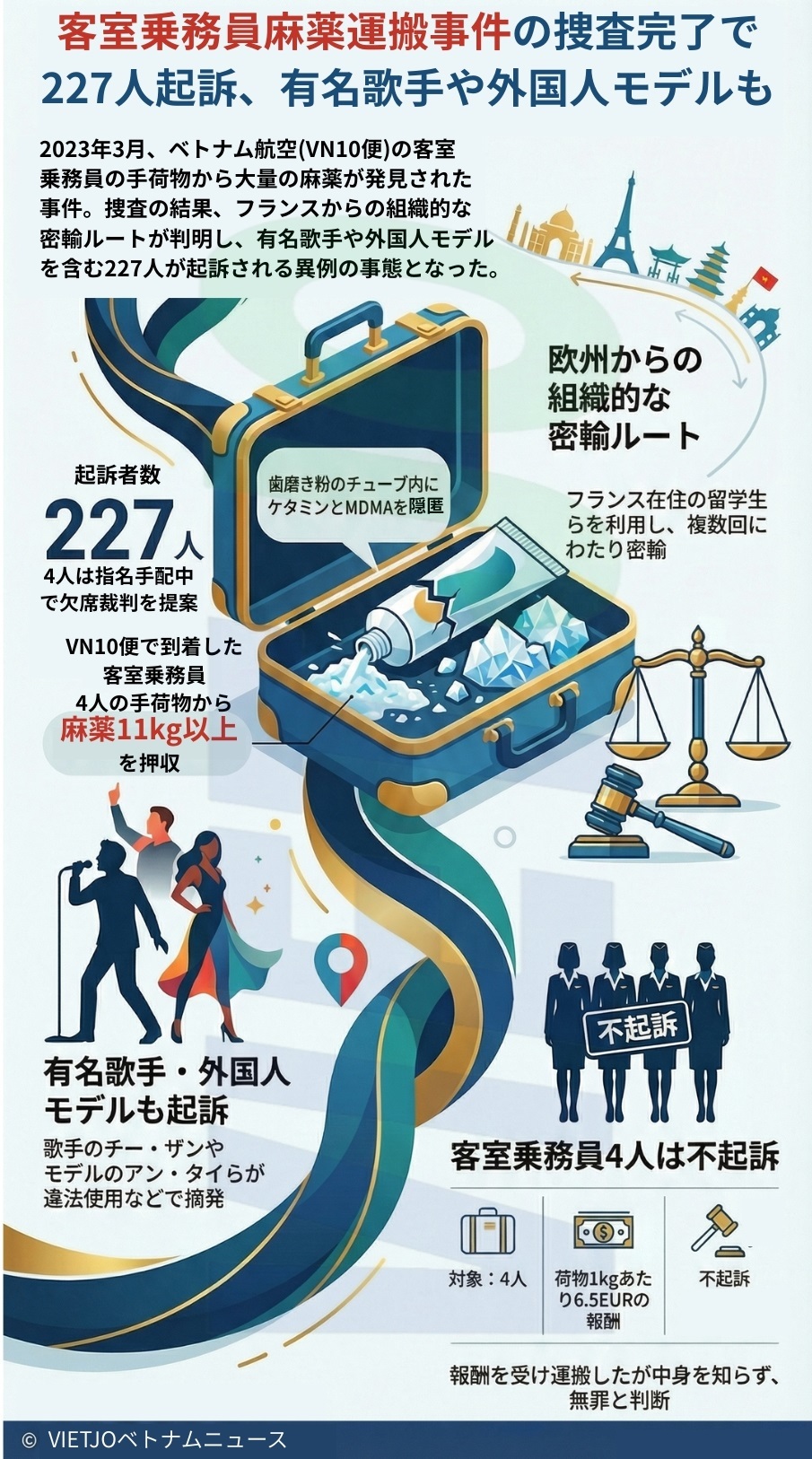 ホーチミン市人民検察院は、2023年3月に発覚した女性客室乗務員による違法薬物密輸事件に関連する「VN10便事件」の特別捜査の起訴状を完成させ、計227人を起訴した。主犯格のホアン・シー・タン容疑者(男)らは、麻薬の違法運搬や売買などの容疑で起訴された。起訴された227人のうち4人は現在指名手配中で、欠席裁判が提案されている。