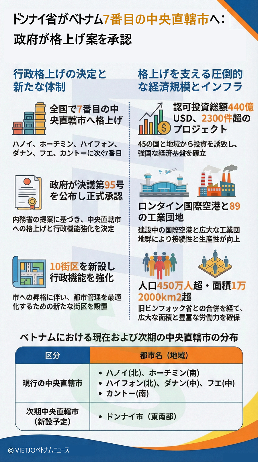 これに先立ち、ドンナイ省人民評議会は3月28日に開催された第11期(2026~2031年任期)の第1回会議で、同省の中央直轄市への格上げに向けた方針を承認する決議を採択していた。現在、ベトナムの中央直轄市はハノイ市、ホーチミン市、北部紅河デルタ地方ハイフォン市、南中部地方ダナン市、北中部地方フエ市、南部メコンデルタ地方カントー市の6市で、新たに設立されるドンナイ市は、全国で7番目の中央直轄市となる見通しだ。